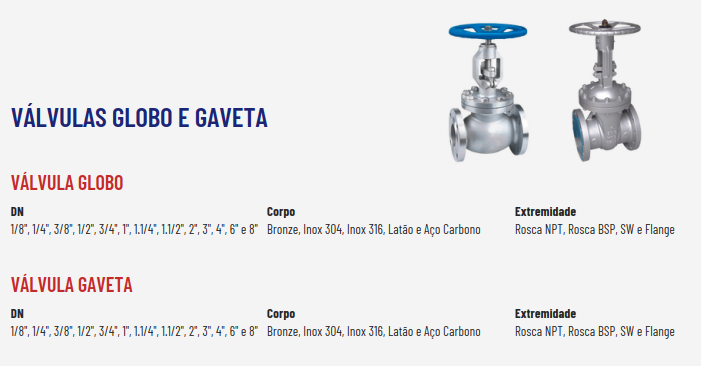 Além das válvulas esfera e borboleta, existem diversos outros tipos projetados para atender necessidades específicas, como válvulas globo, gaveta, diafragma, agulha e solenoide. Cada uma possui características próprias, adequadas para diferentes aplicações, desde sistemas de alta pressão até controle preciso de pequenas vazões.